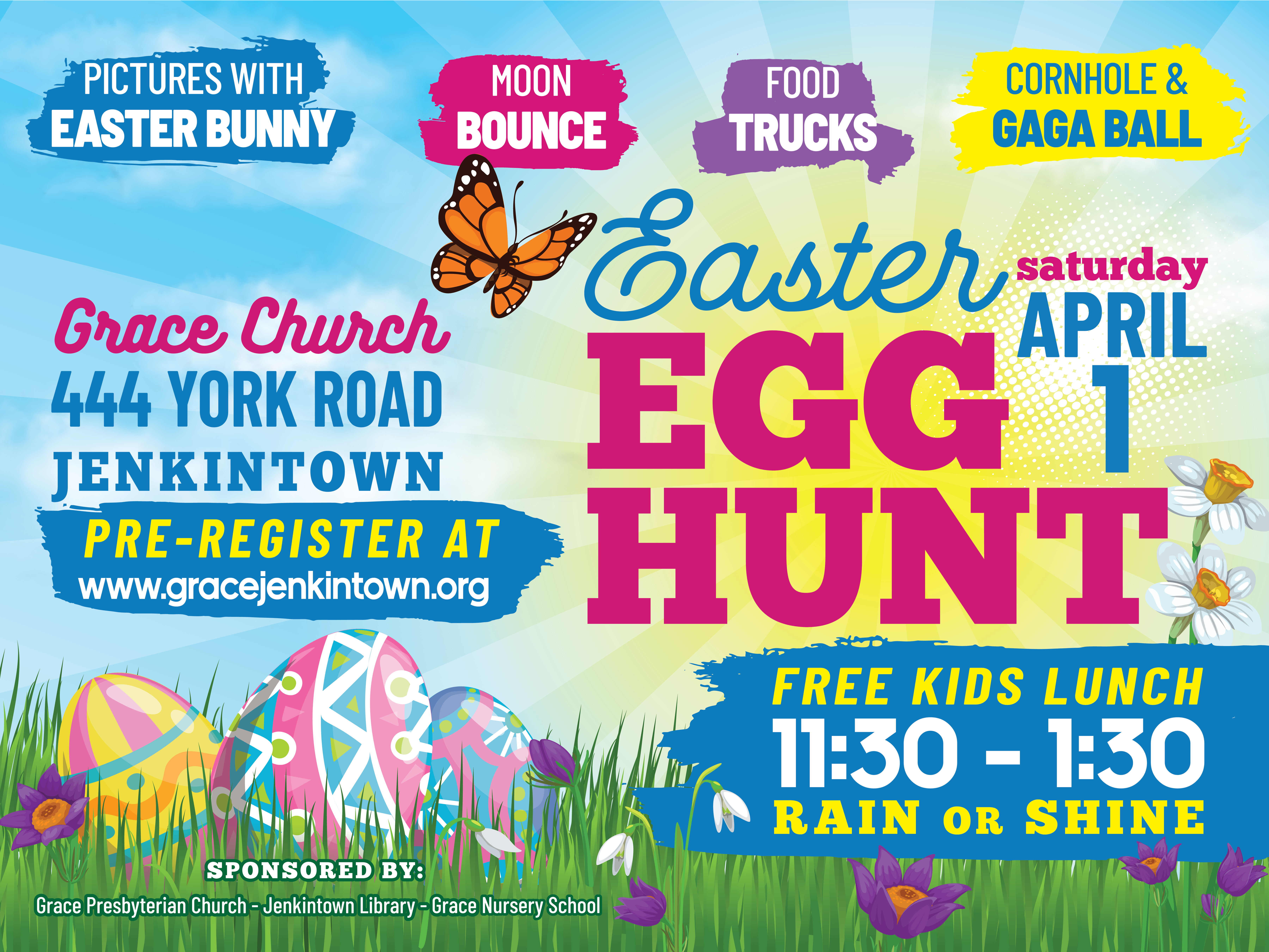 Thanks to our partnership with the Jenkintown Library and the Grace Nursery School we are excited to have you join us for our Easter Egg Hunt Extravaganza. We will be having multiple waves of egg hunts to ensure that children of all ages will have fun while being able to collect a lot of eggs.